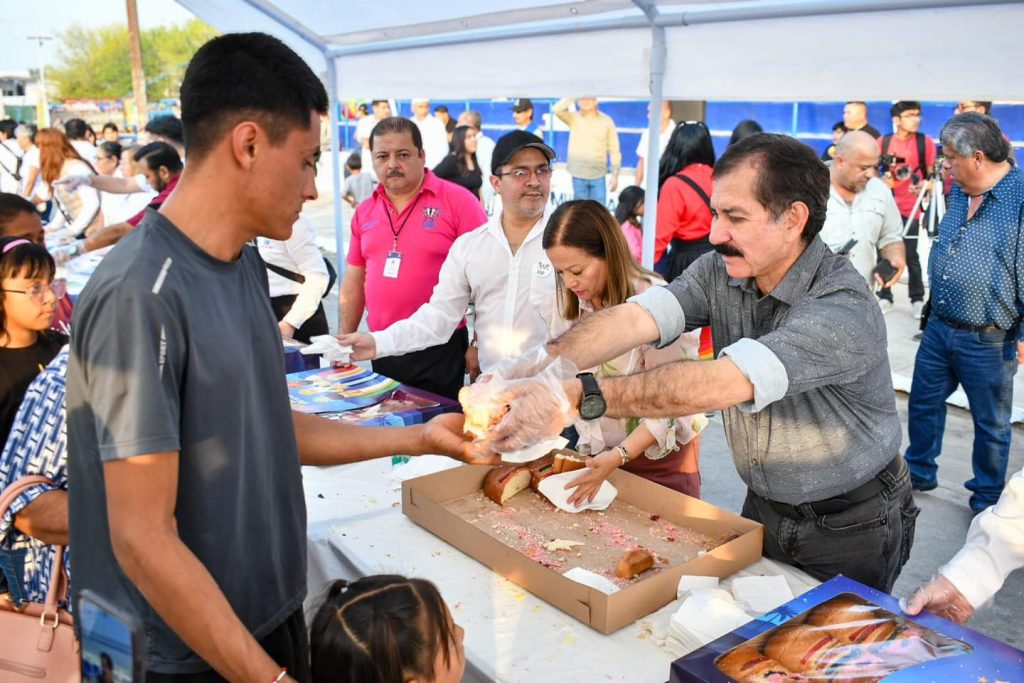 El alcalde de Río Bravo, Miguel Ángel Almaraz, festejó el 6 de enero a lado de la ciudadania, a quienes invitó una rebanada de este postre tradicional.