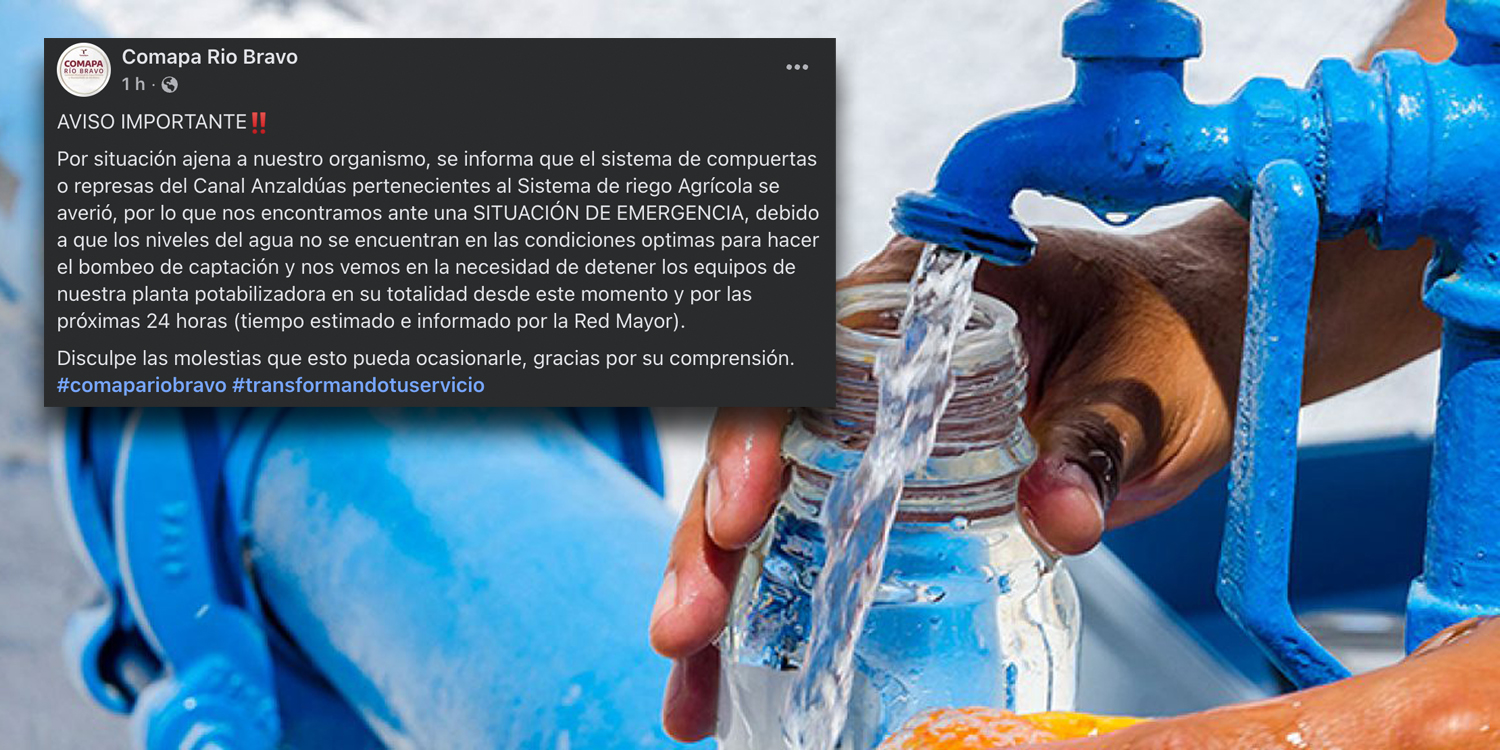 La Comisión Municipal de Agua Potable y Alcantarillado (Comapa) de Río Bravo emitió un aviso de emergencia ante una falla registrada en el sistema de compuertas del Canal Anzaldúas, infraestructura perteneciente al sistema de riego agrícola.